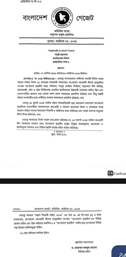 প্রজ্ঞাপনে আরও বলা হয়, সরকার ‘সন্ত্রাস বিরোধী আইন, ২০০৯’ এর ধারা ১৮ এর উপ-ধারা (১) এ প্রদত্ত ক্ষমতাবলে, বাংলাদেশ আওয়ামী লীগের ভ্রাতৃপ্রতিম সংগঠন ‘বাংলাদেশ ছাত্রলীগ’ কে নিষিদ্ধ ঘোষণা করল এবং উক্ত আইনের তফসিল-২ এ ‘বাংলাদেশ ছাত্রলীগ’ নামীয় ছাত্র সংগঠনকে নিষিদ্ধ সত্ত্বা হিসাবে তালিকাভুক্ত করল। ইহা অবিলম্বে কার্যকর হবে।