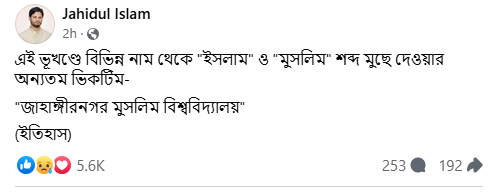 এই ভূখণ্ডে বিভিন্ন নাম থেকে ‘ইসলাম’ ও ‘মুসলিম’ শব্দ মুছে দেওয়ার অন্যতম ভিকটিম- ‘জাহাঙ্গীরনগর মুসলিম বিশ্ববিদ্যালয়’। এমন মন্তব্য করেছেন বাংলাদেশ ইসলামী ছাত্র শিবিরের কেন্দ্রীয় সেক্রেটারি জেনারেল জাহিদুল ইসলাম।
