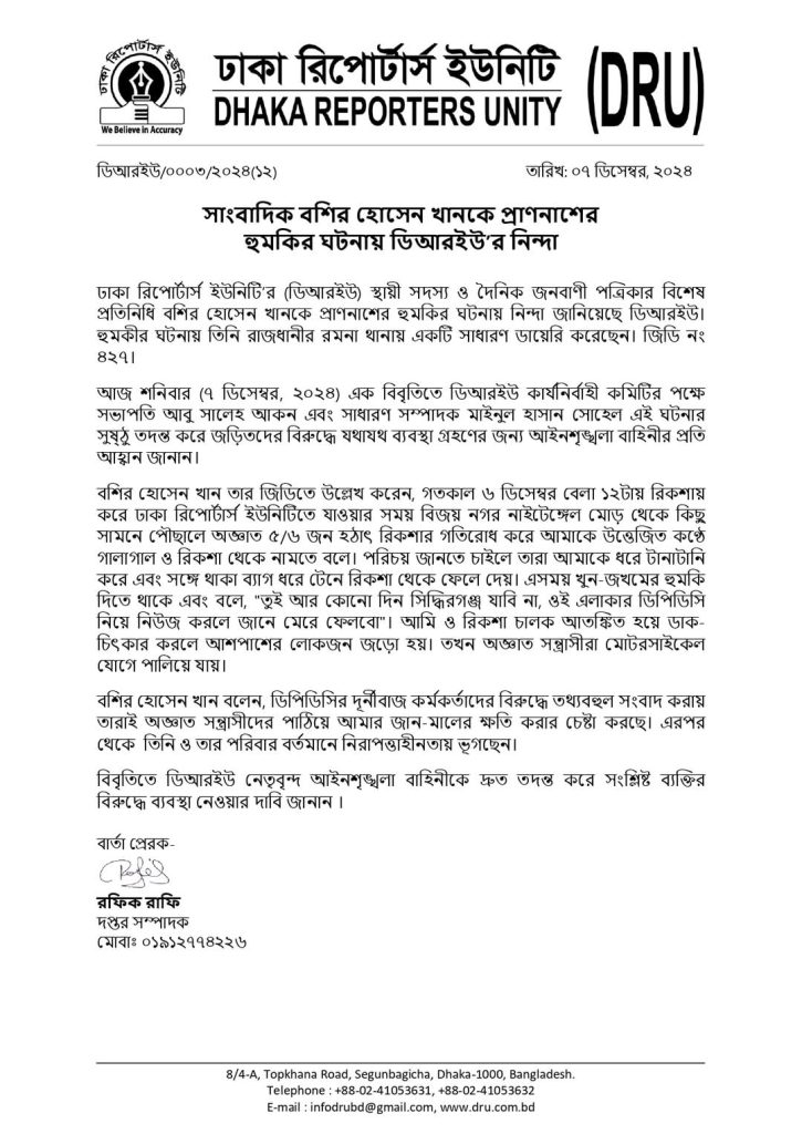 ঢাকা রিপোর্টার্স ইউনিটির (ডিআরইউ) স্থায়ী সদস্য ও দৈনিক জনবাণী পত্রিকার বিশেষ প্রতিনিধি বশির হোসেন খানকে প্রাণনাশের হুমকির ঘটনায় নিন্দা জানিয়েছে ডিআরইউ। হুমকীর ঘটনায় তিনি রাজধানীর রমনা থানায় একটি সাধারণ ডায়েরি করেছেন। সাধারণ ডায়েরি নং ৪২৭।