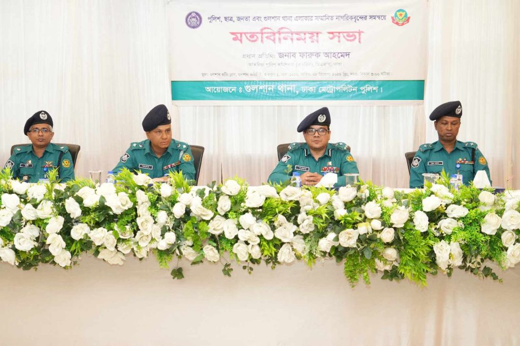 গুলশান বিভাগের উপপুলিশ কমিশনার মো. তারেক মাহমুদের সভাপতিত্বে মতবিনিময় সভায় গুলশান বিভাগের বিভিন্ন পদমর্যাদার কর্মকর্তা, বিভিন্ন রাজনৈতিক, সামাজিক, পেশাজীবী, ধর্মীয় সংগঠনের নেতা এবং ছাত্র-জনতা উপস্থিত ছিলেন।